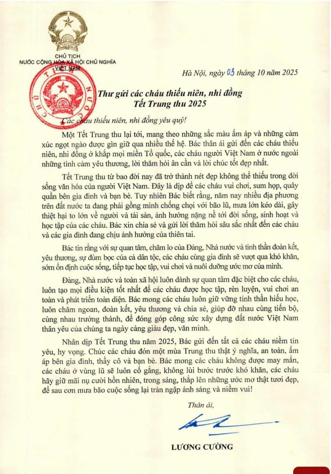Thư gửi các cháu thiếu niên, nhi đồng Tết Trung thu 2025
